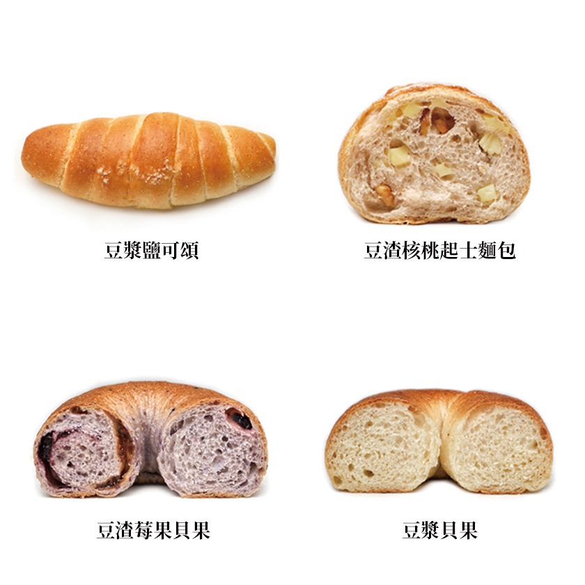 加了豆漿、豆渣的麵包與貝果,口感不太一樣喔!豆漿鹽可頌、豆渣核桃起士麵包、豆渣莓果貝果、豆漿貝果