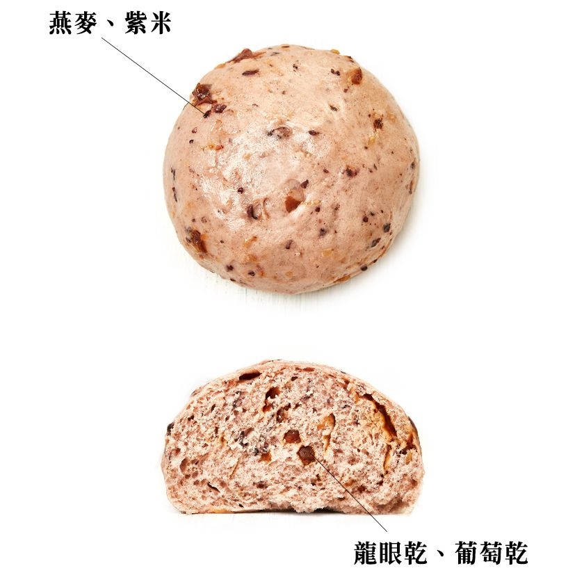 麵粉、秘製紫米餡(紫米/蜂蜜/糖)、燕麥、龍眼乾、葡萄乾、糖、酵母。