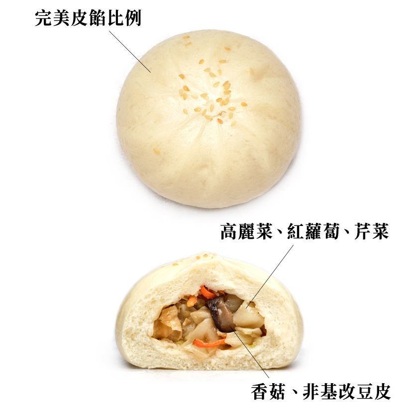 麵粉、秘製菜包餡(高麗菜/紅蘿蔔/非基改豆皮/芹菜/香菇/香油/白胡椒)、糖、酵母。