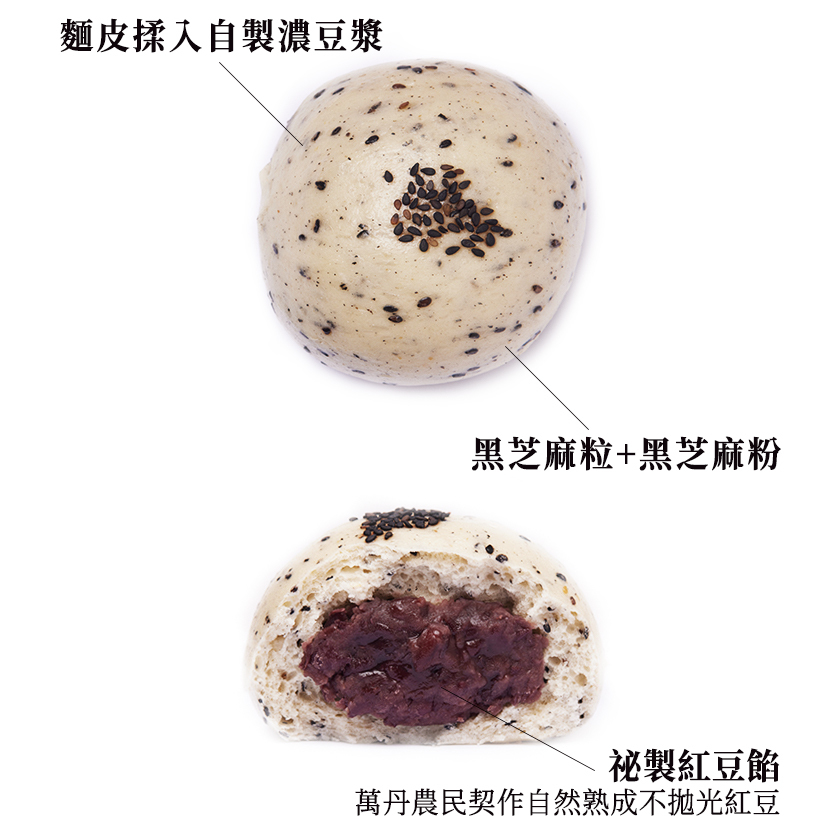 麵粉、自製濃豆漿(加拿大單一品種非基改黃豆/熟漿蒸煮技術)、黑芝麻、糖、秘製紅豆餡(萬丹紅豆/奶油/糖/蜂蜜/鹽)萬丹農民契作自然熟成不拋光紅豆、酵母。