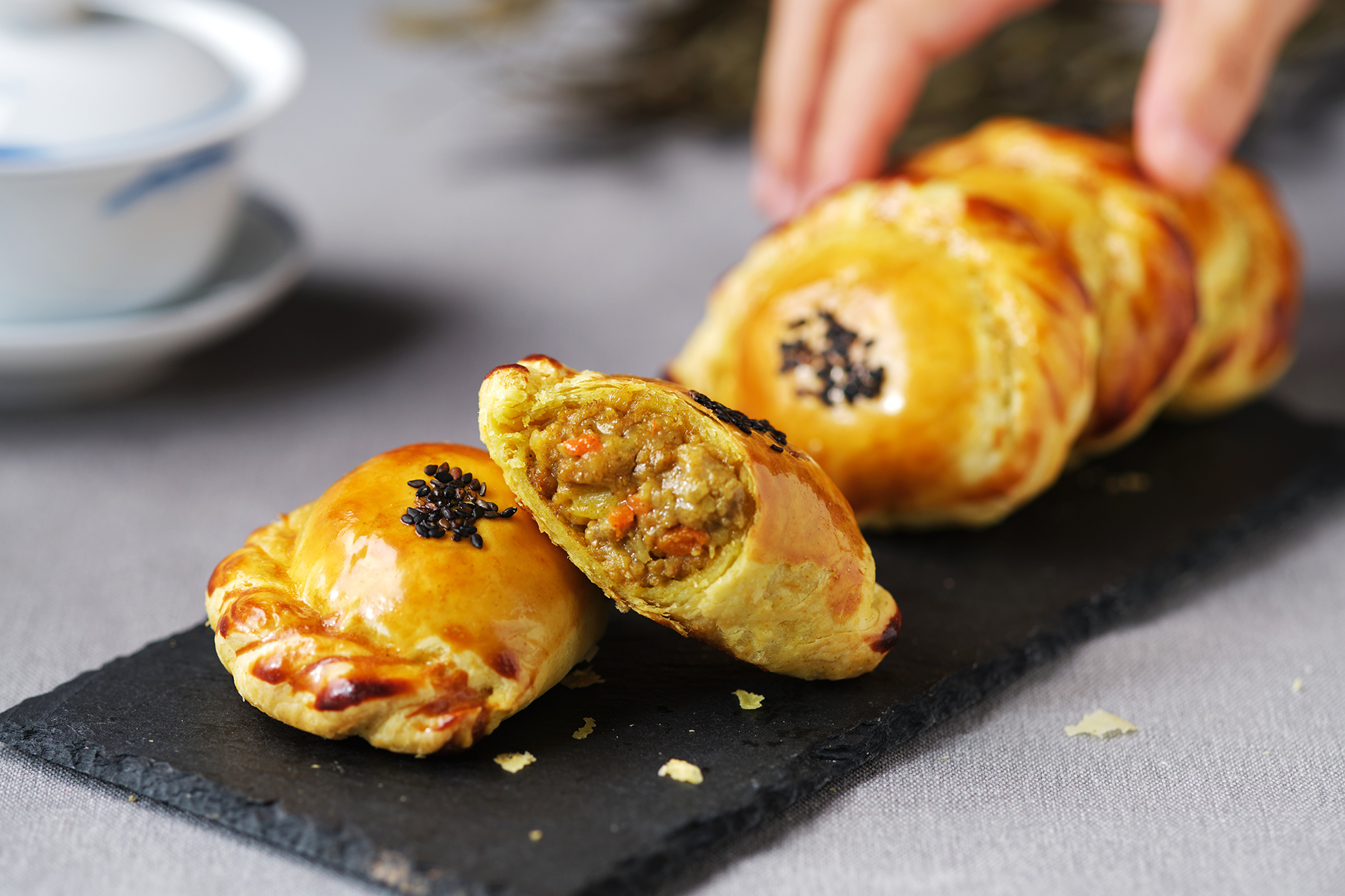 自家炒製的咖哩豬肉餡,濃香深邃;添加咖哩粉揉製的中式酥皮,暖黃色澤迷人。