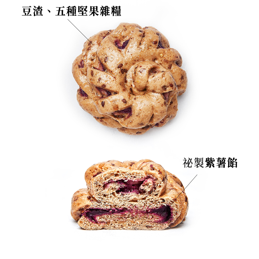 成分:麵粉、豆渣、穀物之母-紅藜麥、核桃、葵花子、南瓜子、亞麻籽、糖、秘製紫薯餡(紫心蕃薯/無鹽奶油/動物性鮮奶油/低溫殺菌蛋/糖)、酵母。