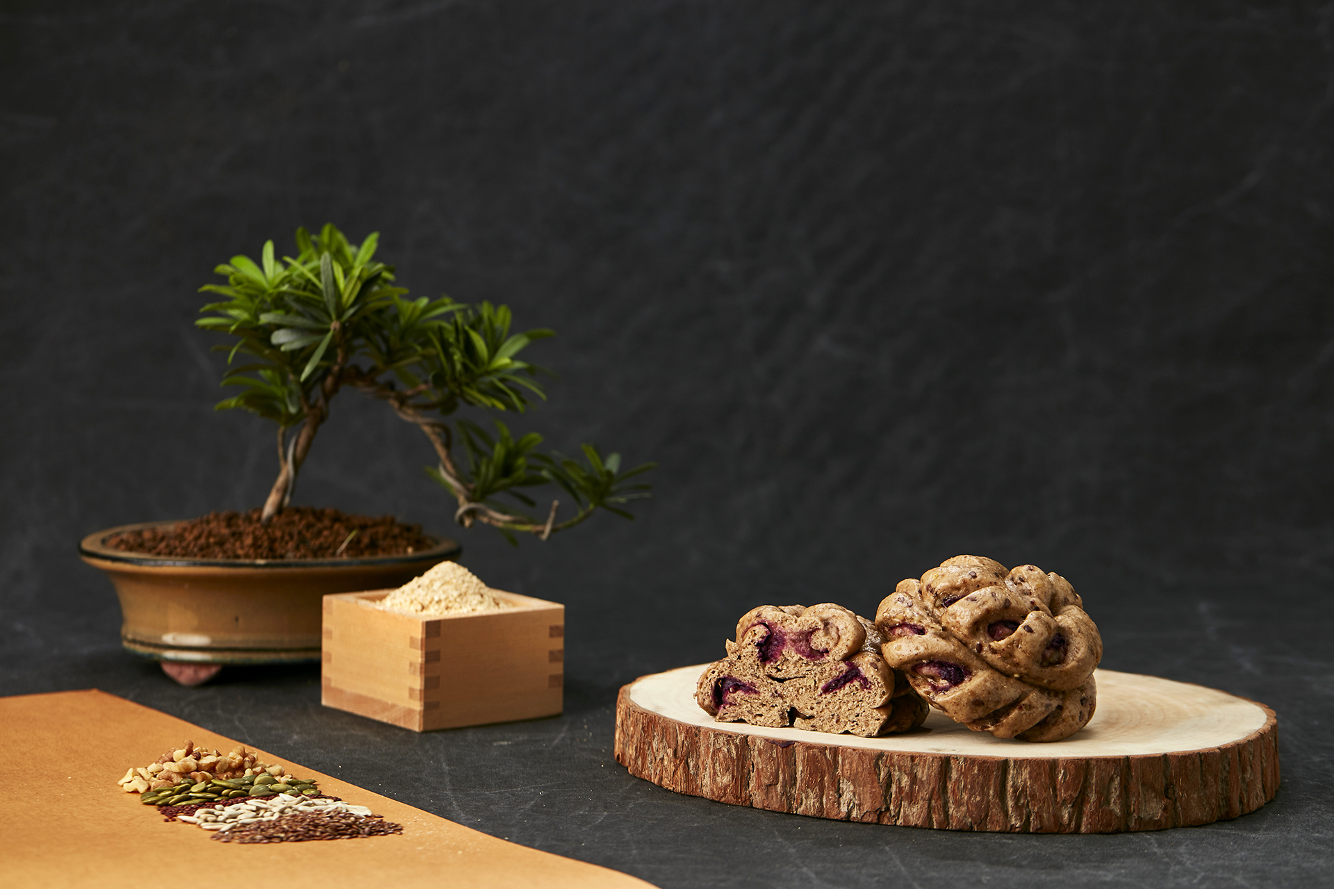 揉入豆舖子自製烤豆渣紅藜麥、核桃、葵花子、南瓜子、亞麻籽,Q彈麵團帶有鬆脆嚼感;抹上秘製紫薯餡手捲成型,口感綿密,滋味淡雅不甜膩。